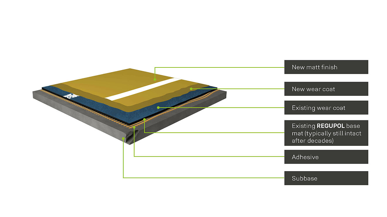 Are you planning to renovate the floor in your sports hall? With REGUPOL dynamic FL, it couldn’t be easier. We simply apply a new liquid, seamless coating of polyurethane on top of the old (even if damaged) floor and this gives the entire sports hall floor a brand new appearance. The colour as well as all the lines and markings are also renewed. However, the existing floor surface does need a little preparation, such as a thorough sanding down or maybe even partial or extensive repairs to sections of the floor. The advantage of renovation with REGUPOL dynamic FL is that you don’t need to remove the entire floor system from the hall. Our pre-fabricated REGUPOL base mat remains in placeas a system component, since the properties of REGUPOL remain largely unchanged, even after years of use.