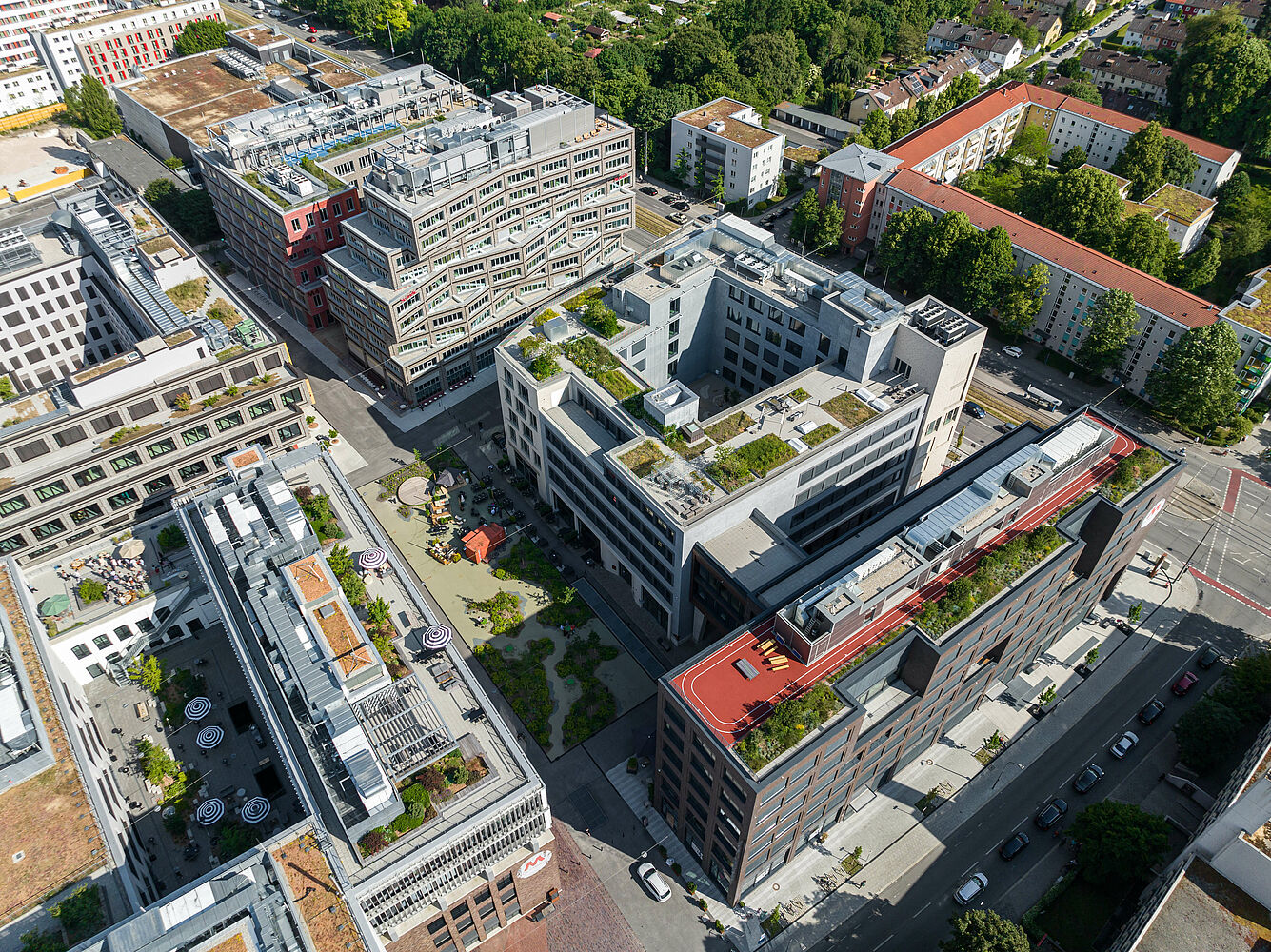- Modern working environments, retail, outdoor areas and terraces, gastronomy, fitness studio, hotel